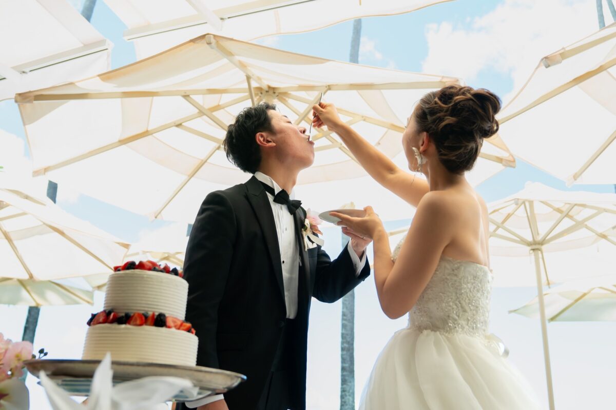 ウェディングケーキのカット、ファーストバイト、乾杯