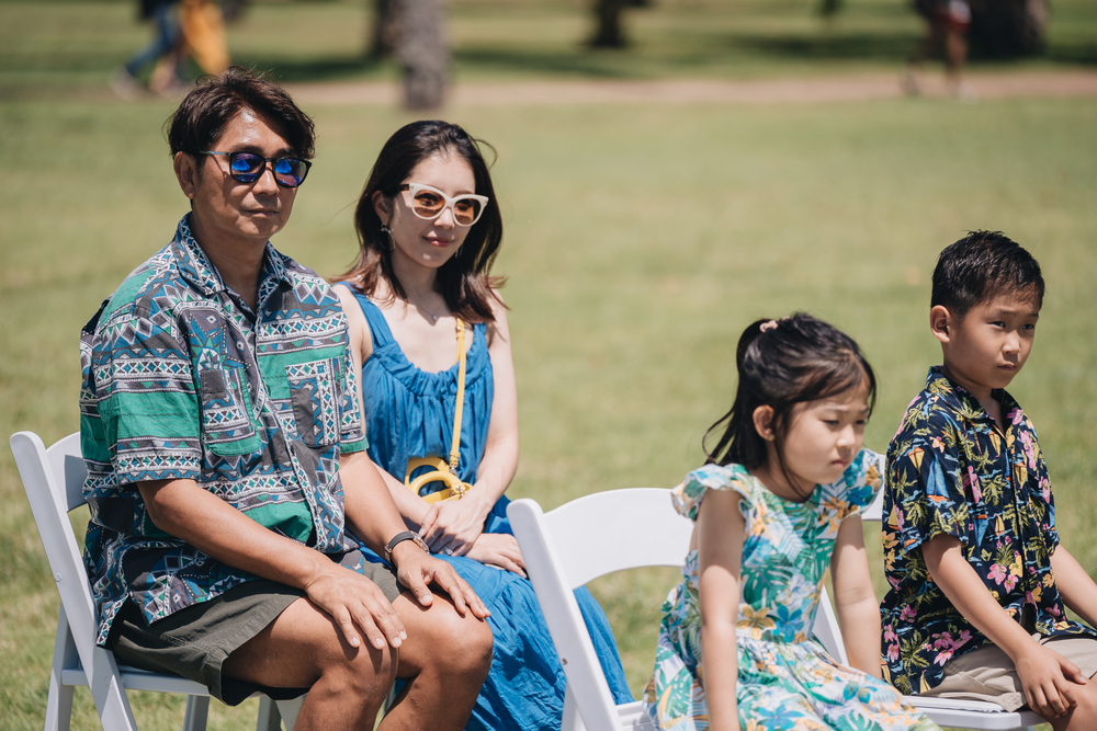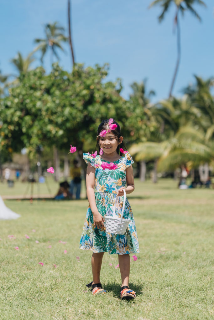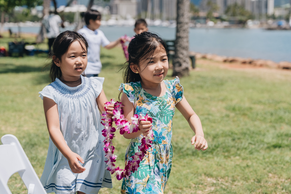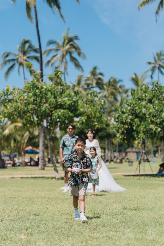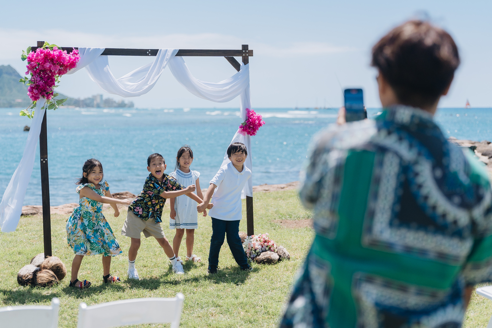 参加するお子様ゲストたちも リラックスした表情で みんなの笑顔が眩しい ハワイのビーチウェディング