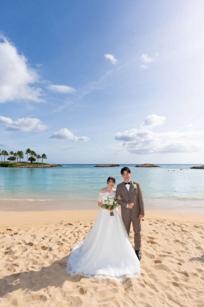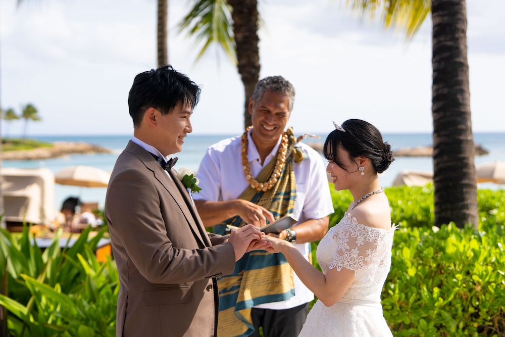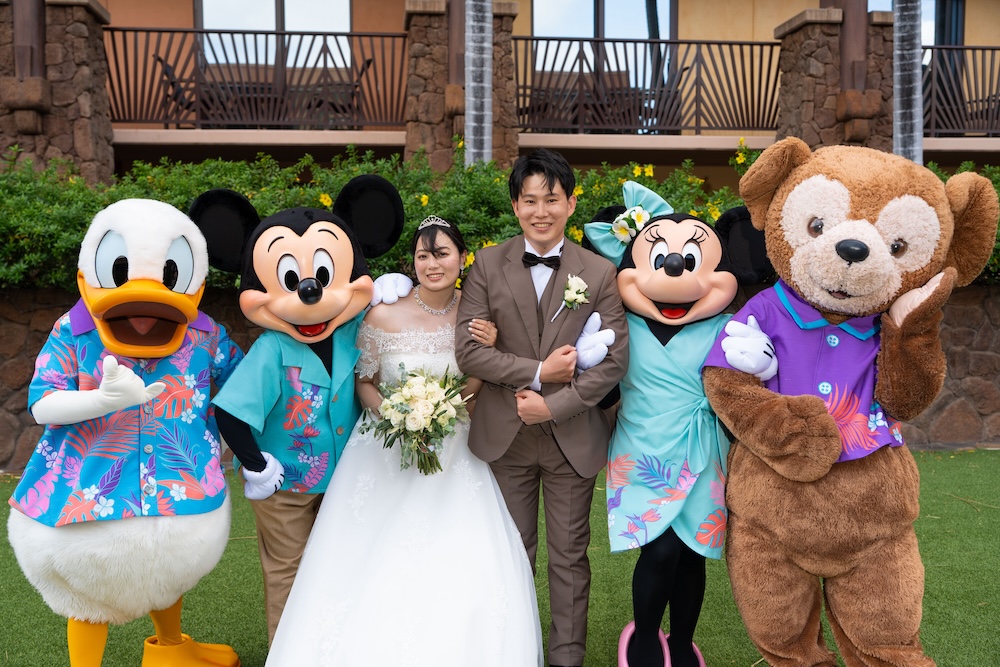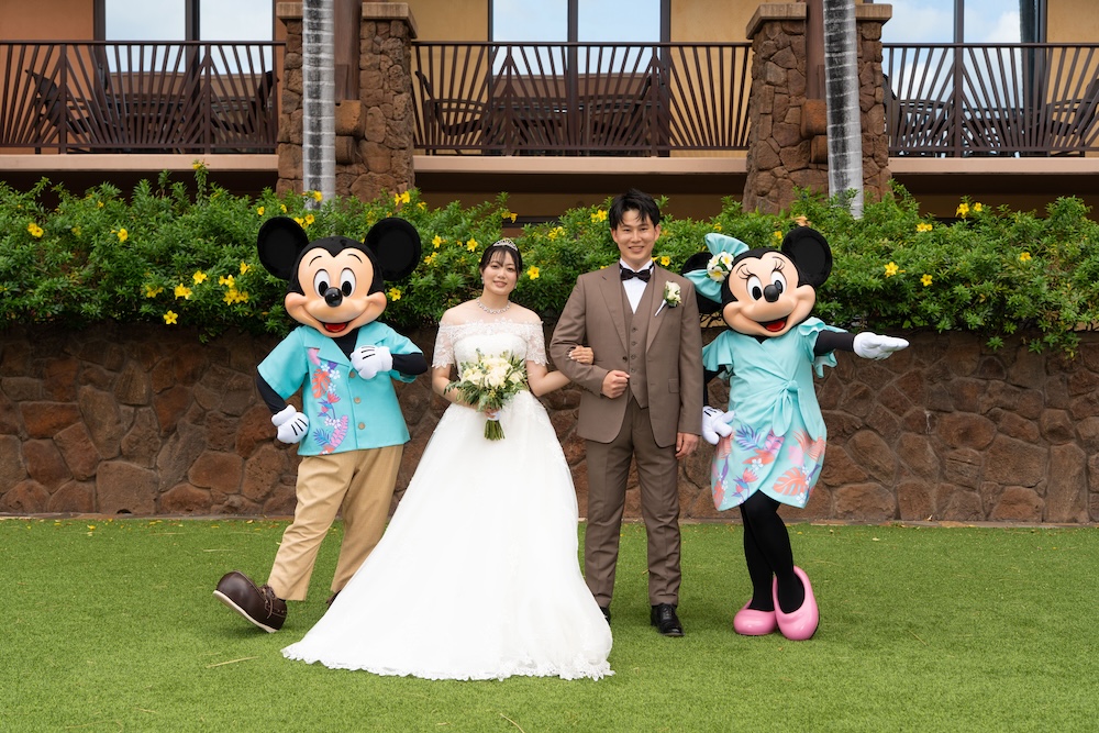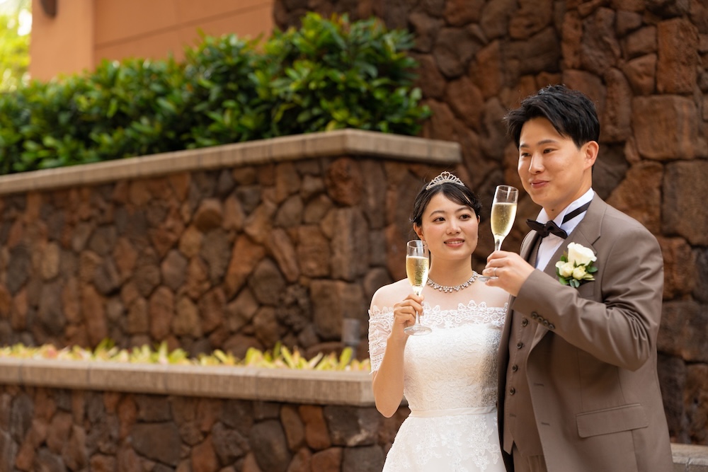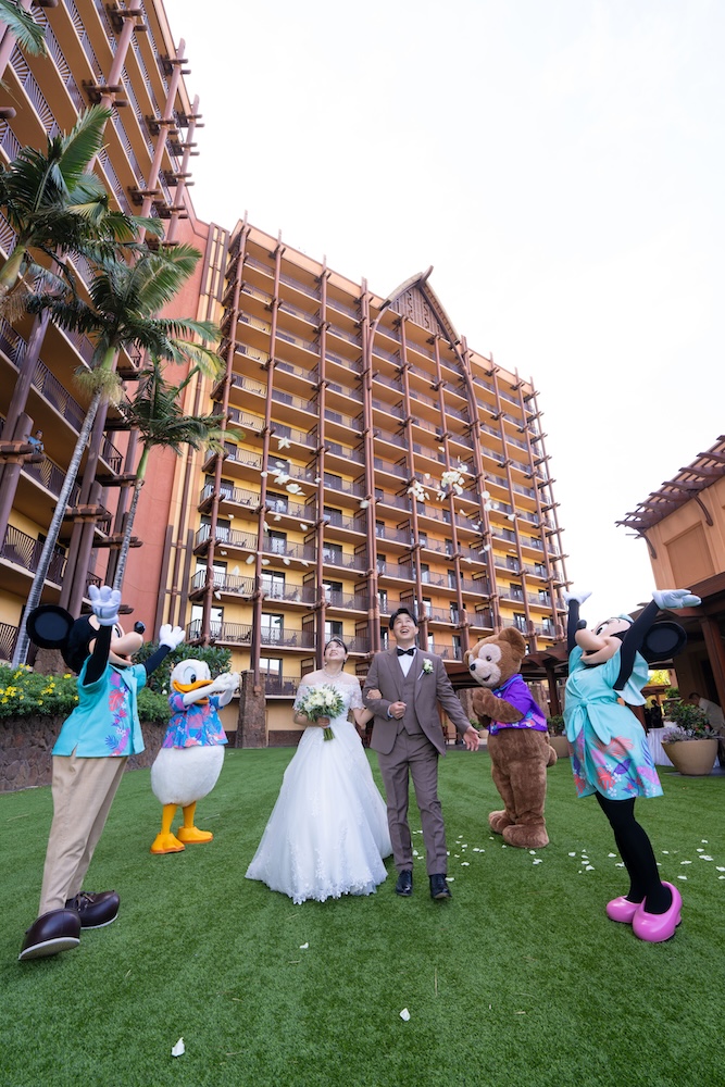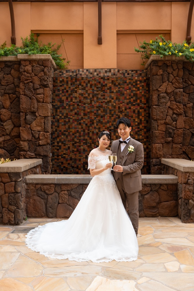 2025.05.13 アウラニホテル ディズニー リゾート ウェディング★Voice★ 投稿者:kaori 投稿公開日:2026/01/13 投稿カテゴリー:お客様の声 アウラニホテルで大好きなキャラクターにお祝いしてもらえるハワイウェディング 挙式後のキャラクターセレブレーションは一生の思い出に! Date 挙式会場:アウラニ ディズニー リゾート ウェディングフォトグラファー:アウラニ ディズニー リゾートフローリスト:アウラニ ディズニー リゾートウェディングプランナー:Rei ★Voice★ Q.1 レアウェディングを選んだ理由があれば教えて下さい。お問い合わせの段階で何社かと連絡を取らせていただいていたのですが、レアウェディングさまが一番丁寧で、返信も早く安心できたからです。Q.2 実際に挙式の日を迎えられていかがでしたか?挙式の日の中で一番印象に残っている出来事などあれば教えて下さい。挙式の前日の晩からソワソワしておりましたが、怪我などが無いようなるべく落ち着いて過ごすよう心掛けておりました(笑)当日はヘアメイクの時点で「いよいよだな…」と思い、無事に挙式を迎えられることの喜びを噛み締めつつ夢心地でした。アウラニディズニーリゾートでの結婚式ということで、キャラクターセレブレーションを一番楽しみにしておりましたので、キャラクターに会えた時は感無量でした。また、挙式中に近くのプールに居た方々が祝福してくださり、わっと盛り上がった場面があり、日本ではあまり感じられることのない温かさを感じられて新鮮で嬉しかったです。Q.3 挙式のご準備はいかがでしたか?ドレスの持ち運びが大変ではありましたが、他はスムーズに準備することができました。Q.4 ハワイウエディングで何かこだわったことはありましたか?リングピローやウェルカムボードなど、小物のモチーフを海で統一してハワイ感を意識していました。参列者なしでの挙式でしたが、せっかくのハワイウエディングでしたので、小物にこだわりました。Q.5 ハワイウエディングをして良かったということがあれば教えてください。・日本には無い素晴らしい景色(海や自然)の中で挙式を行うことができ、また撮影をしていただけたこと。・Q2で記載したようにアットホームな雰囲気で挙式を行えたこと。周囲の方々からたくさんお声掛けいただき、祝福してもらえて、日本ではできない経験ができました。・ハワイが特別な地になったこと。今後ハワイ旅行をする際も、「挙式をした地」として思い出に残り続けることが嬉しいです。Q.6 先輩カップルとして、未来の新郎新婦様にひとことアドバイスをお願いします。異国の地での挙式は、分からないことや不安なことがたくさんあるかと思いますが、どんな些細なことでもプランナーさんに質問すべきだと思います☻レアウェディングさまは全ての質問にとっても丁寧に答えてくださいますので、そこで不安を解消していくことが、自分なりの挙式を形作っていける道標になります! おすすめ 2023.2.25 ハレクラニ+ハウテラス★Voice★ 2024/02/14 2019.05.22 モアナルアガーデン ハワイアンスタイル 2019/12/20 2023.9.11 マジックアイランド(Wウェディング) 2024/09/10